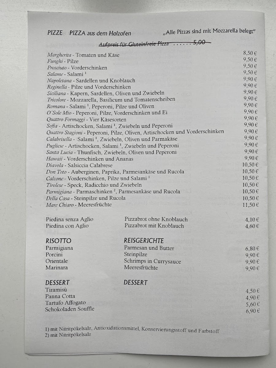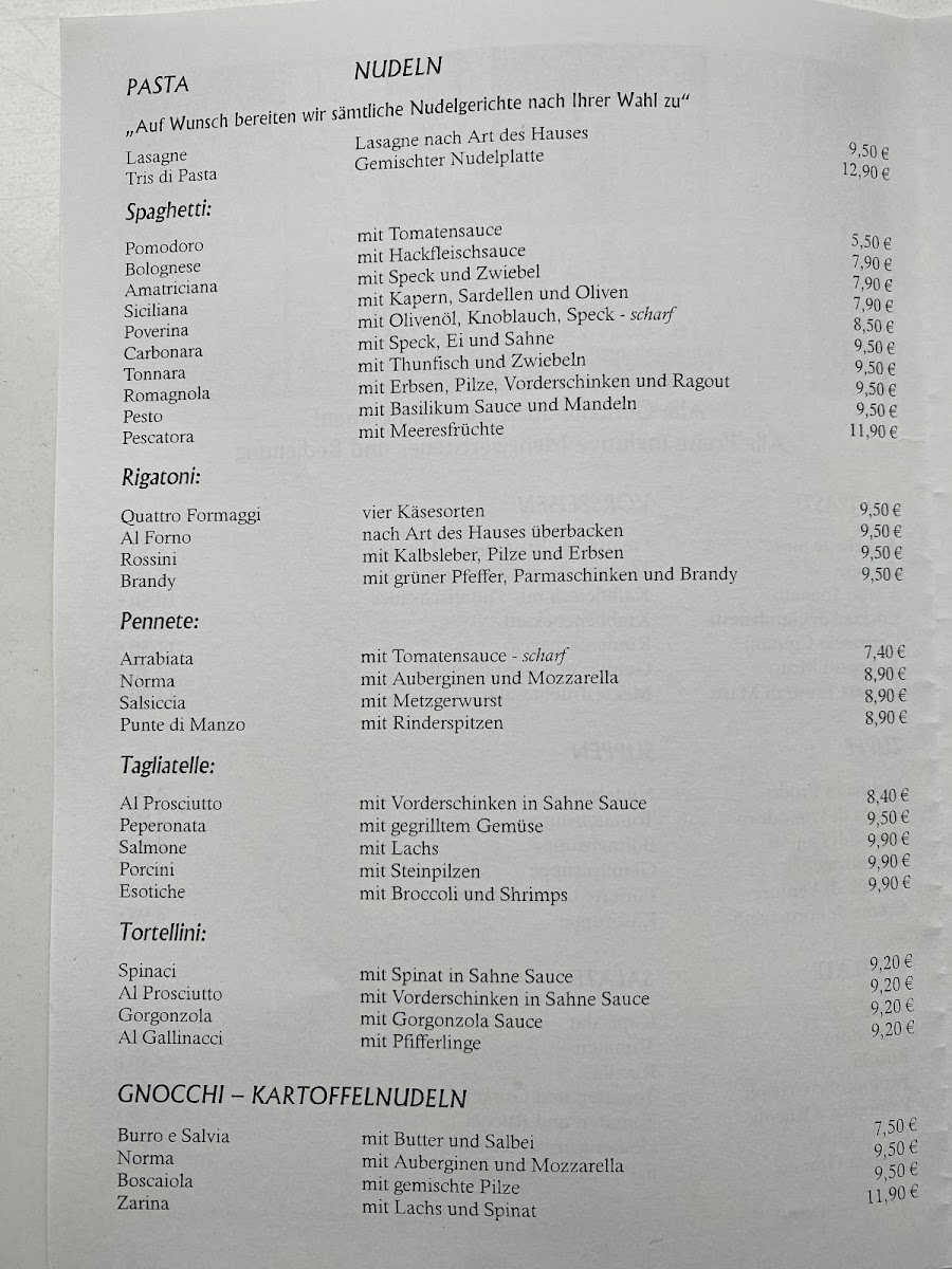 The appetizers section features items such as mixed bruschette selections, carpaccio, and seafood options like grilled calamari. Pasta dishes include specialties like gnocchi, ravioli, lasagne, and tagliatelle with salmon. The pizza offerings cover a range of toppings including tuna with onions and capers, salami, mushrooms, and calzone. Main courses also include seafood and meat dishes, such as swordfish with wild garlic risotto and vitello tonnato.